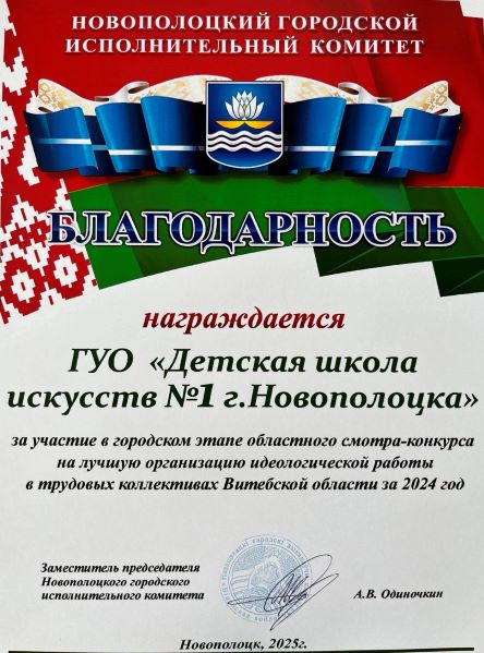 Наши успехи и усилия, направленные на достижение этих успехов были замечены администрацией города и отдела и, по итогам работы за 2021 год Детская школа искусств №1 г.Новополоцка занесена на городскую Доску почёта, как лучшее учреждение в сфере культуры. Ещё одним приятным сюрпризом было вручение нашему учреждению Благодарности председателя Витебского облисполкома за большой вклад коллектива в дело воспитания и развития подрастающего поколения.